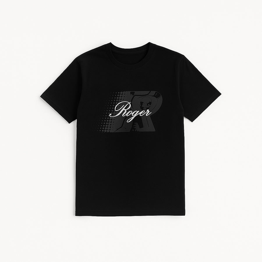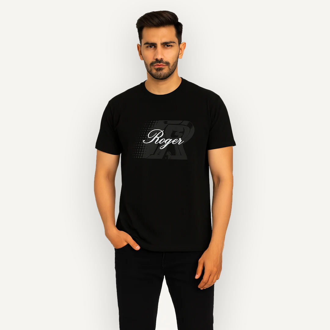 Step up your style game with the BLACK "R ROGER" print T-shirt for men. This sleek black tee features a bold "R ROGER" design that adds a fun, confident vibe to your casual look. Perfect for everyday wear, it pairs effortlessly with jeans or shorts, making it your go-to for laid-back adventures and playful outings.