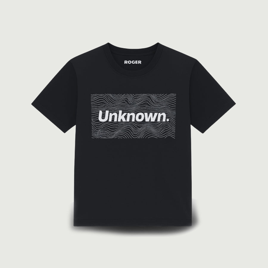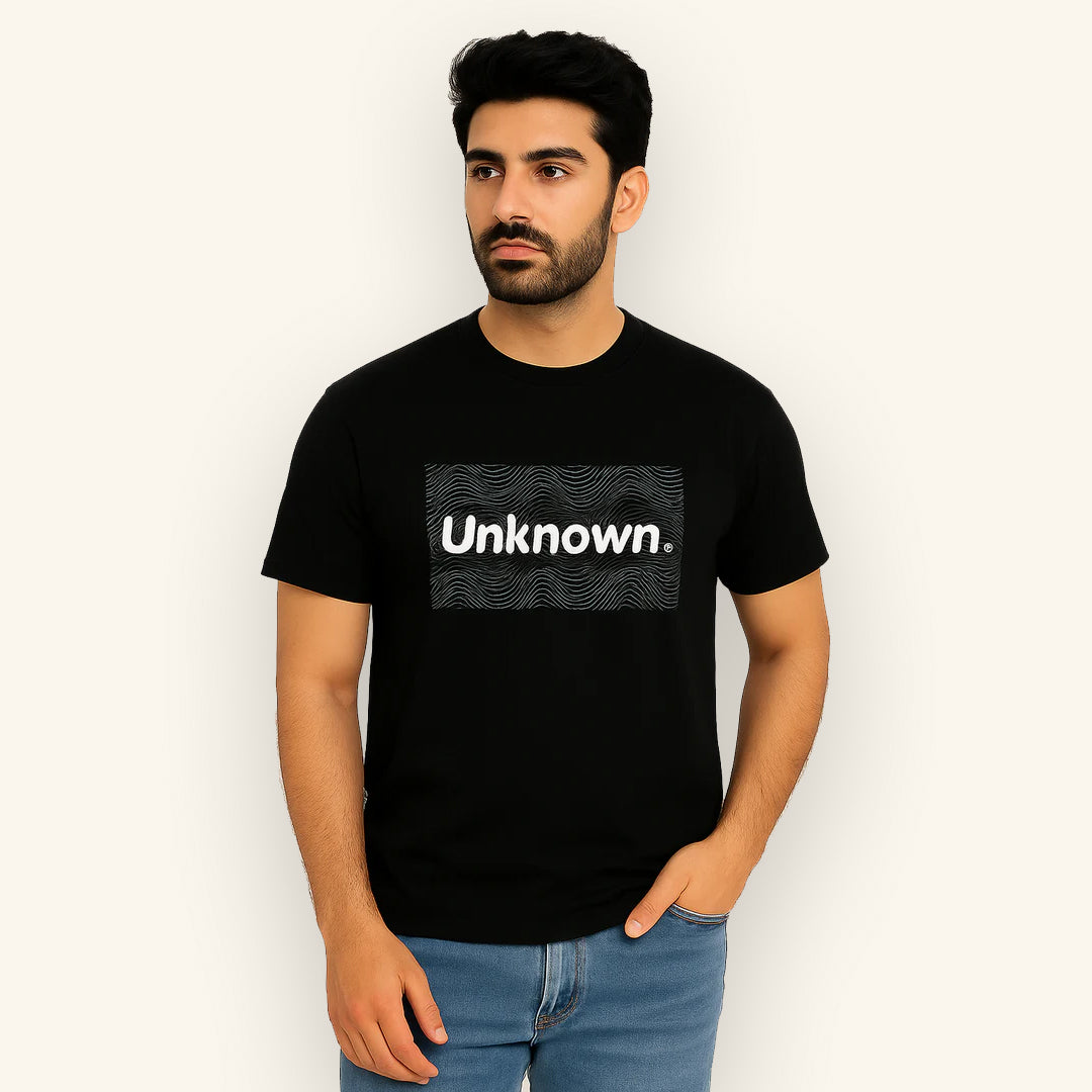 Step into the spotlight with this black "UNKNOWN" print t-shirt for men. Its striking design adds a playful edge to your look, while the soft fabric ensures all-day comfort. Perfect for those who like to keep a little mystery in their style!