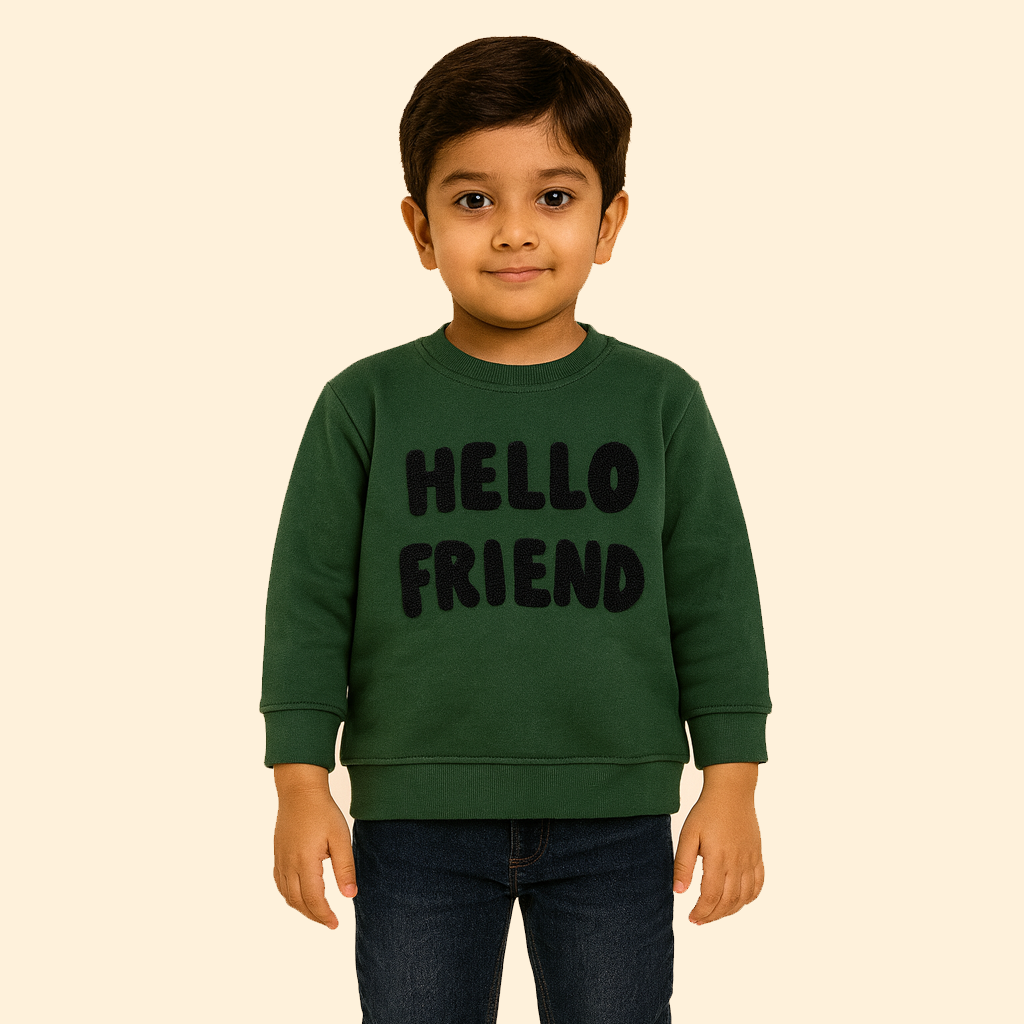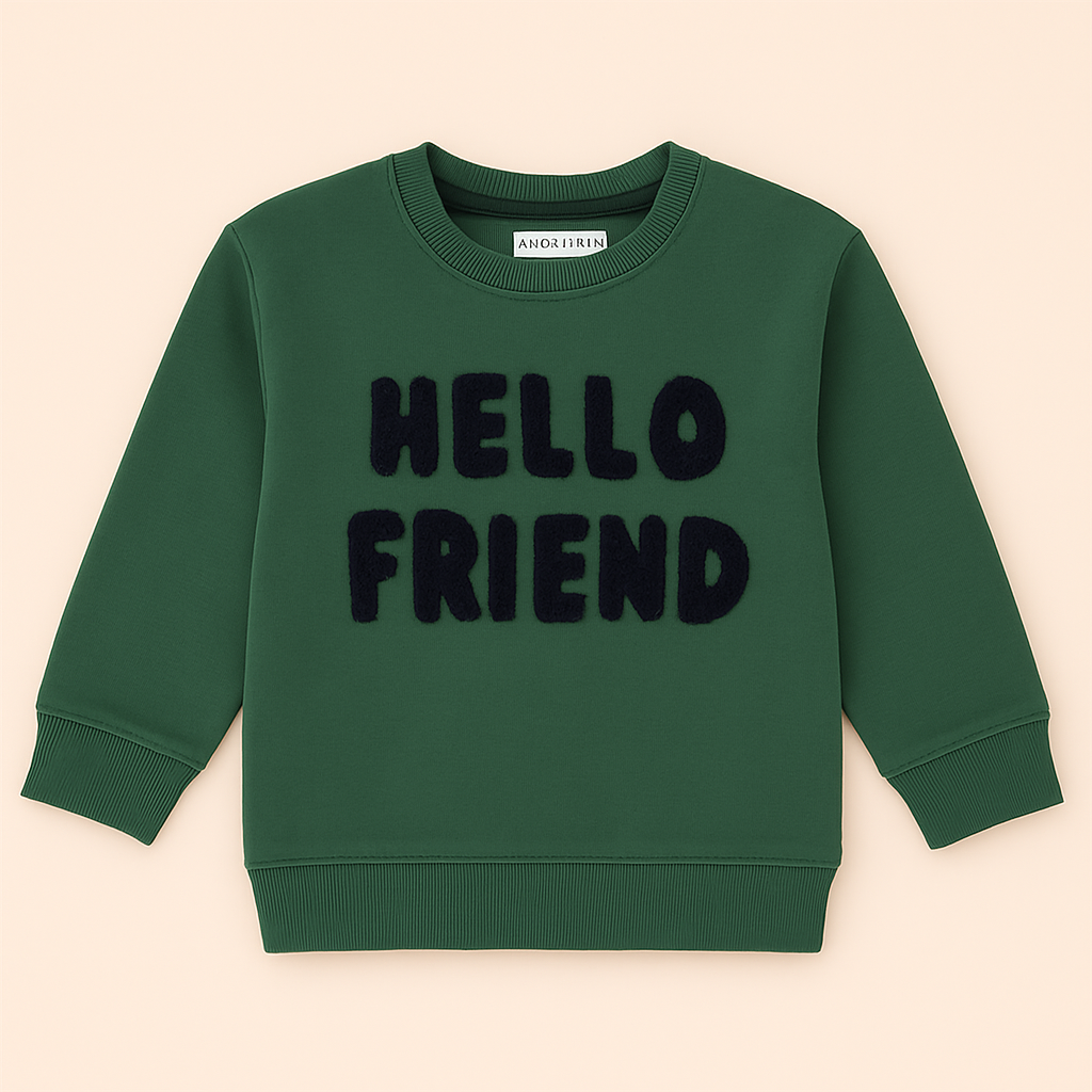 Say hi to cozy vibes with the Green Hello Friend Embroidered Terry Fabric Sweatshirt! Made from soft terry fabric, it offers all-day comfort while the friendly embroidery adds a cheerful, playful touch to your look. Perfect for spreading good vibes wherever you go!