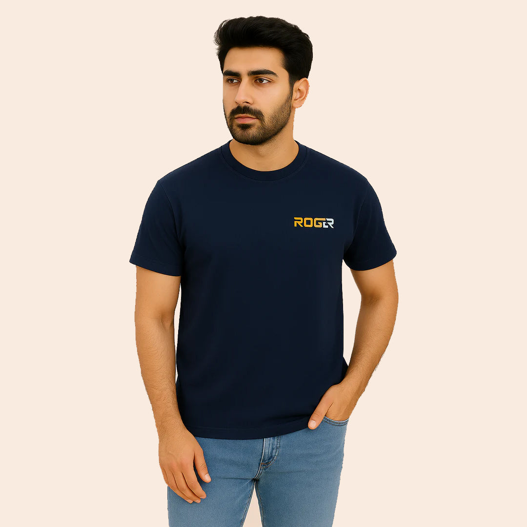Bring a splash of fun to your wardrobe with the Navy Blue "Roger" Print T-Shirt for Men. Its vibrant print and rich navy color make it a playful choice for casual days, adding personality to your outfit while keeping you comfy and cool. Perfect for those who like to mix style with a bit of cheeky charm.