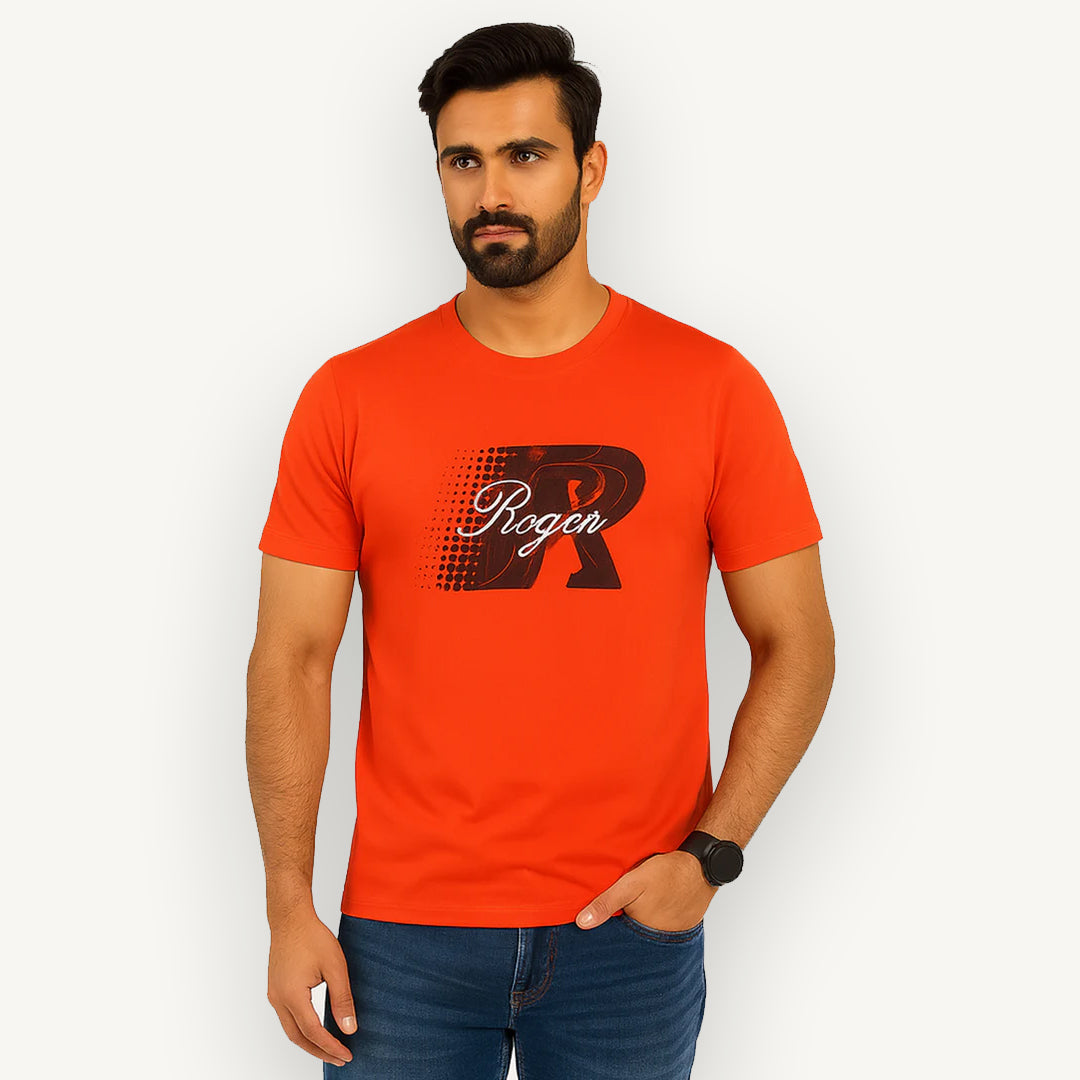 Add a pop of fun to your day with this vibrant orange "Roger" print T-shirt for men. Bright and bold, it’s designed to keep you comfortable while turning heads. Perfect for those who like to keep things playful and lively, this tee is your go-to for a cheerful, casual look.