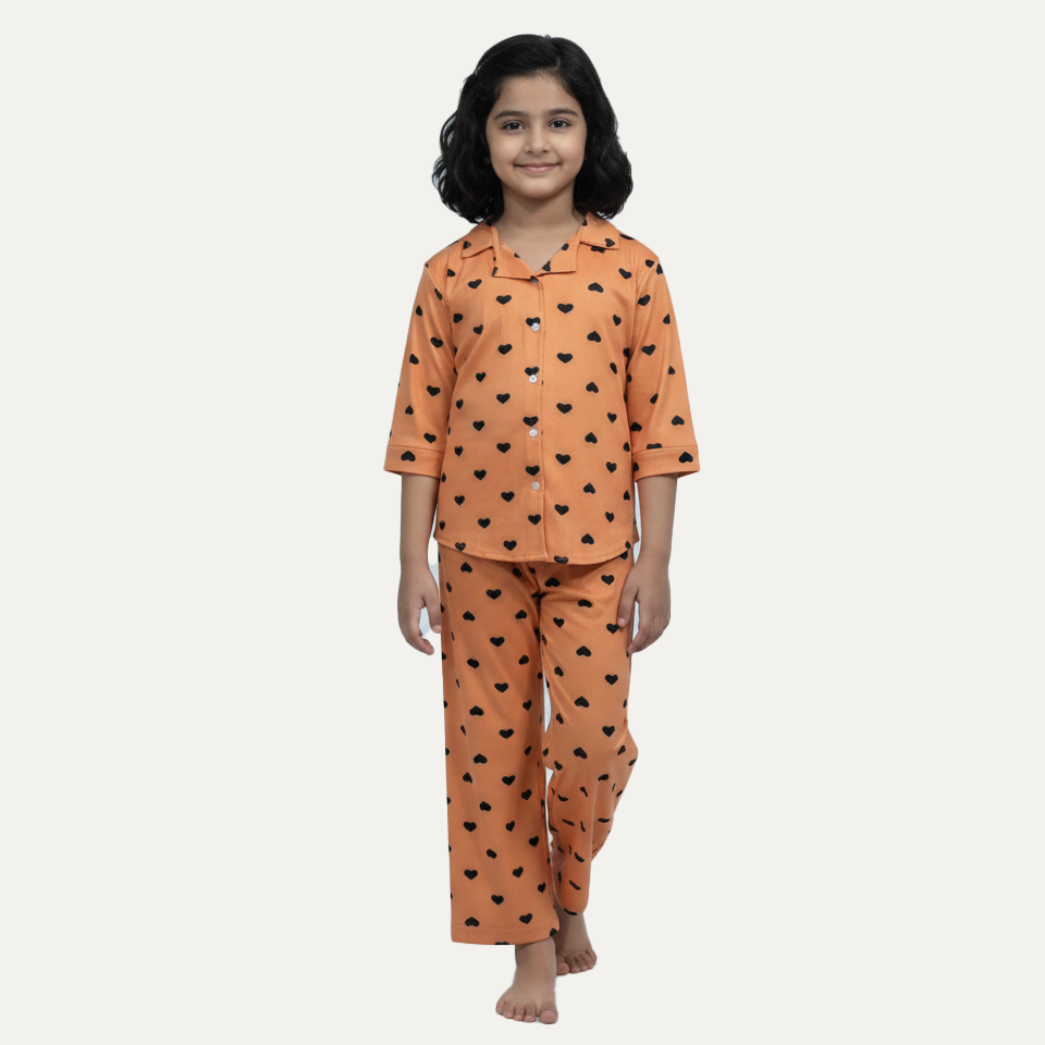 Spread joy in this cheerful orange co-ord suit covered in sweet heart prints! This vibrant two-piece set is perfectly coordinated so she can look effortlessly put-together every time. Crafted from flexible ribbed fabric that's gentle on skin and built for movement, it's ideal for active girls who love comfort without compromising style. Perfect for school, playdates, or casual outings, this delightful ensemble lets her express her fun-loving personality. The warm orange hue paired with charming hearts makes this a wardrobe must-have!