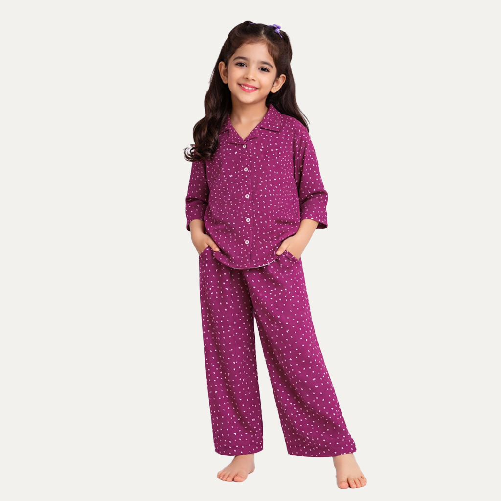 Purple Dots Print Co-ord Ribbed Fabric Suit For Girls