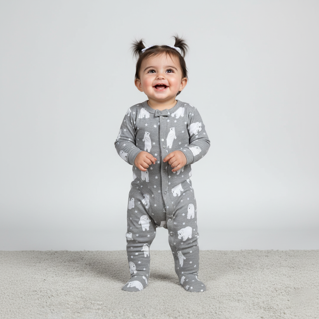 This romper features a charming grey bear and stars print, as well as full body and full sleeves for complete coverage. Made with soft and comfortable fabric, it's perfect for keeping your little one cozy and stylish. A must-have addition to any baby's wardrobe.