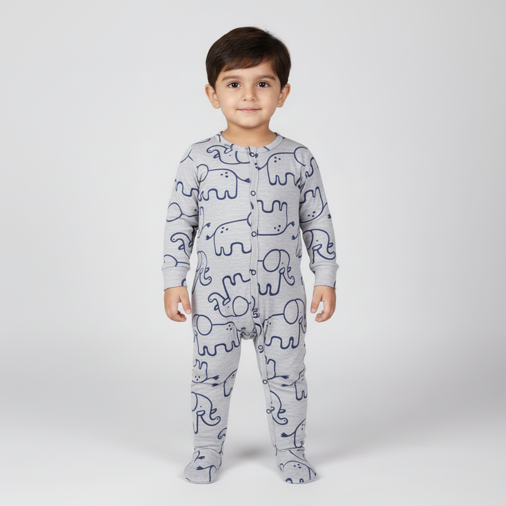 Stay cozy and stylish with our GREY ELEPHANT PRINT FULL BODY FULL SLEEVES ROMPERS. Made with soft, durable fabric, this romper features a cute elephant print and full body and sleeves coverage for ultimate comfort. Perfect for any occasion, this piece will become a staple in your wardrobe.