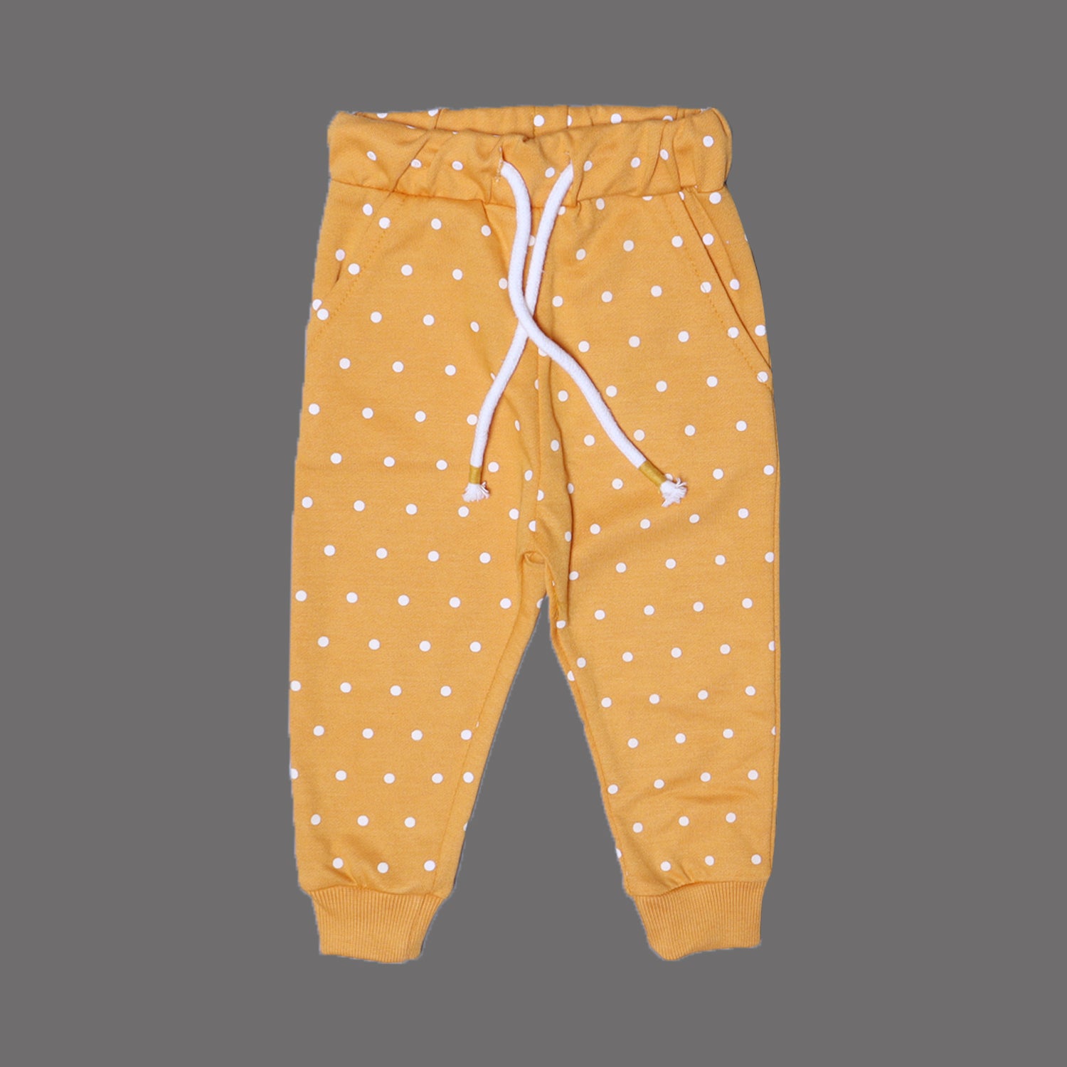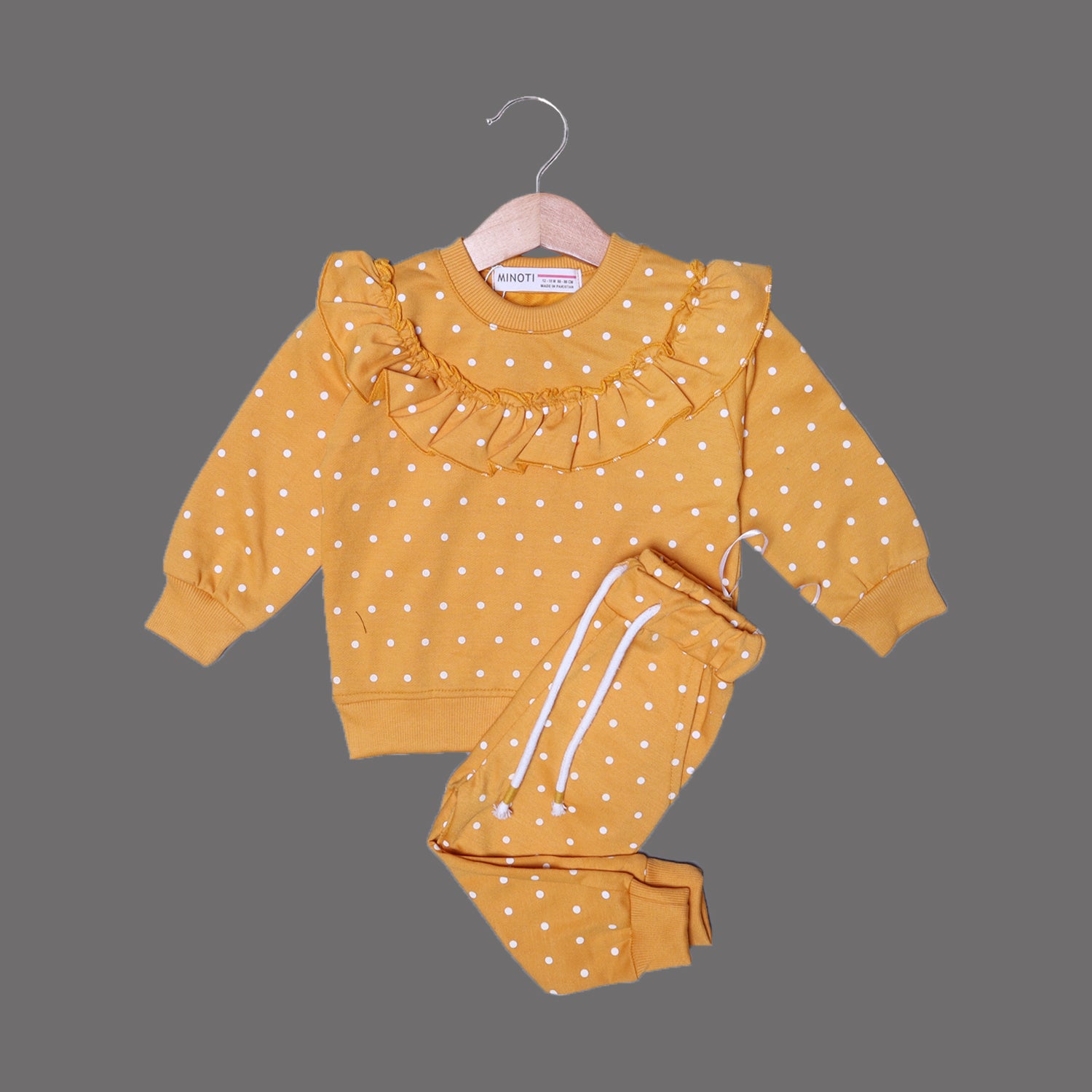 This MUSTARD FRIL SWEATSHIRT & TROUSER print is crafted from a soft terry fabric, perfect for keeping you cozy in the winter. Featuring a unique polka dot design, this outfit is sure to make a statement. Crafted for warmth and comfort, the set is perfect for any occasion.