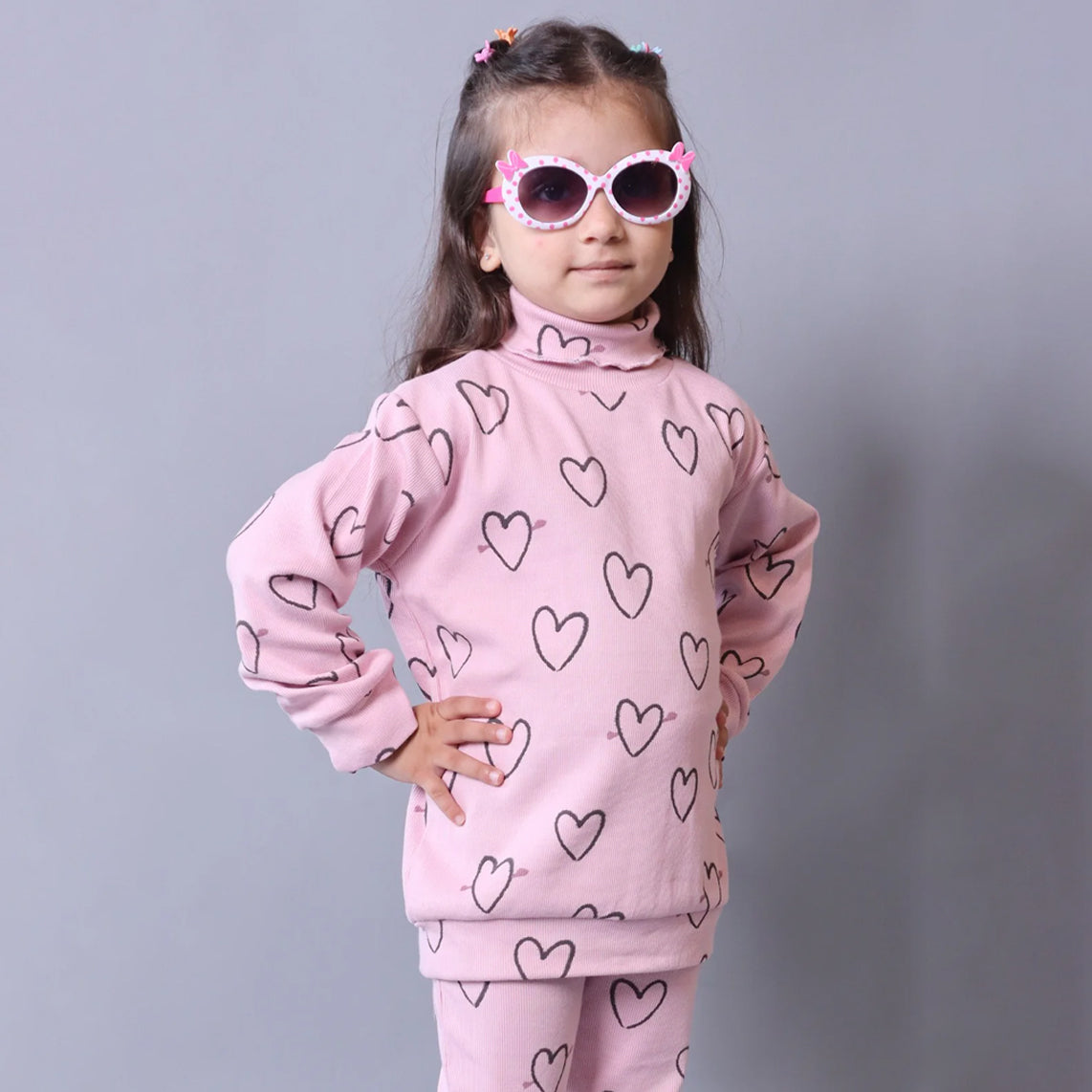 PINK HIGH NECK & FRIL TROUSER "HEARTS" PRINTED RIBBED FABRIC WINTER SUIT