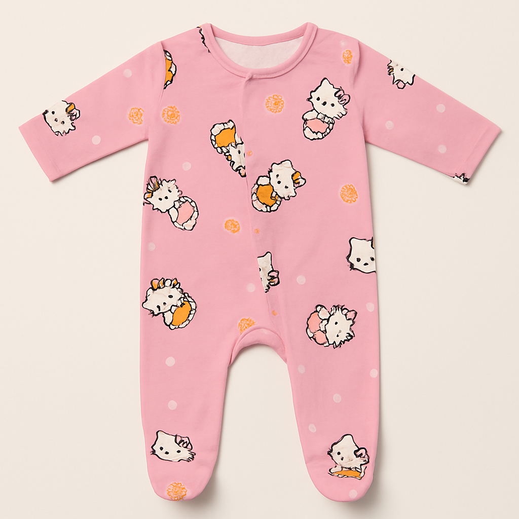 This pink romper features an adorable kitten print, perfect for cozy winter days. Soft and snug, it keeps little ones warm while adding a touch of playful charm to their outfit. Easy to wear and cute to look at, it’s a winter must-have for your little bundle of joy.