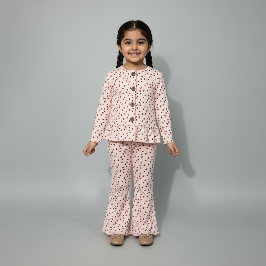 Adorable pink frock featuring cheerful strawberry prints that'll make your little one smile! This charming two-piece set combines a sweet printed frock with comfortable matching trousers, perfect for playdates, family gatherings, or everyday wear. The playful strawberry design adds a fun pop of color while the soft fabric keeps her comfortable all day long. An ideal choice for girls who love vibrant, fruity fashion!