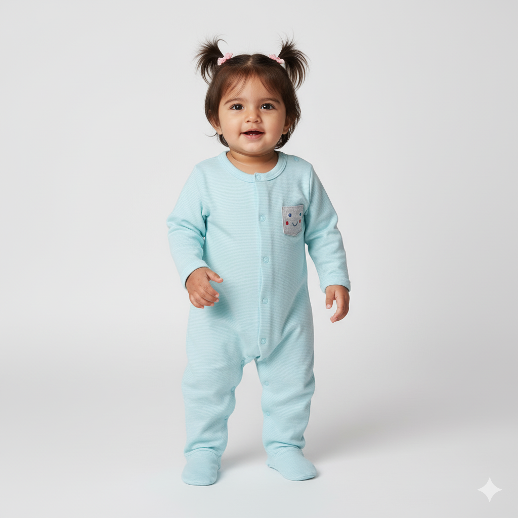 SKY BLUE SMILY FACE EMBROIDERED BOTH SIDES FULL BODY FULL SLEEVES ROMPERS