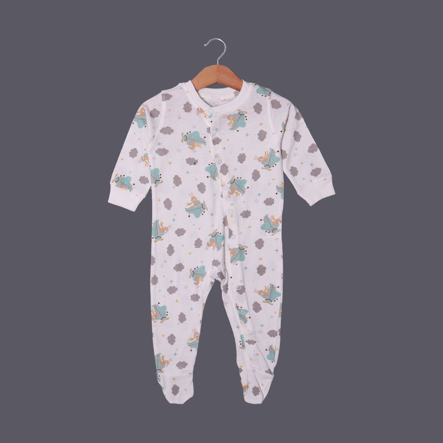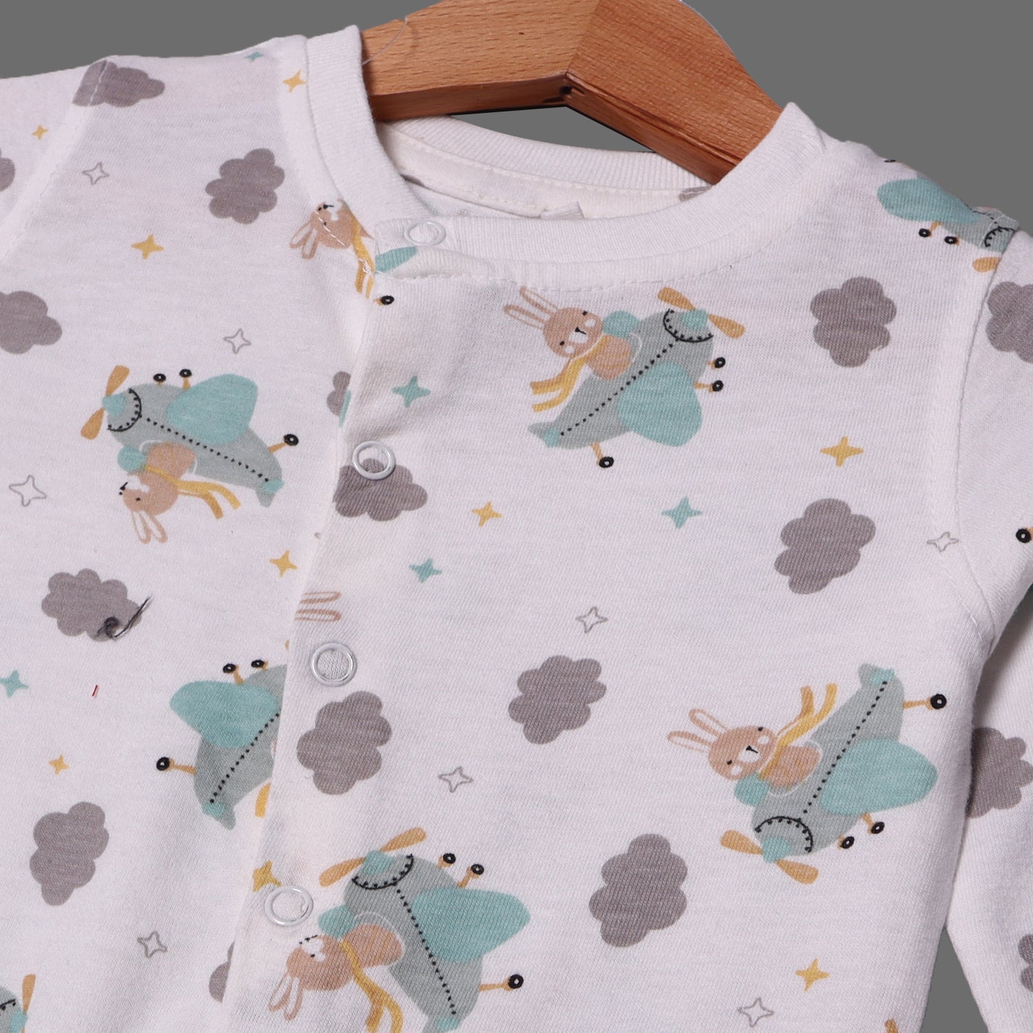 WHITE CLOUDS RABBIT ON PLANE PRINTED FULL BODY FULL SLEEVES ROMPERS