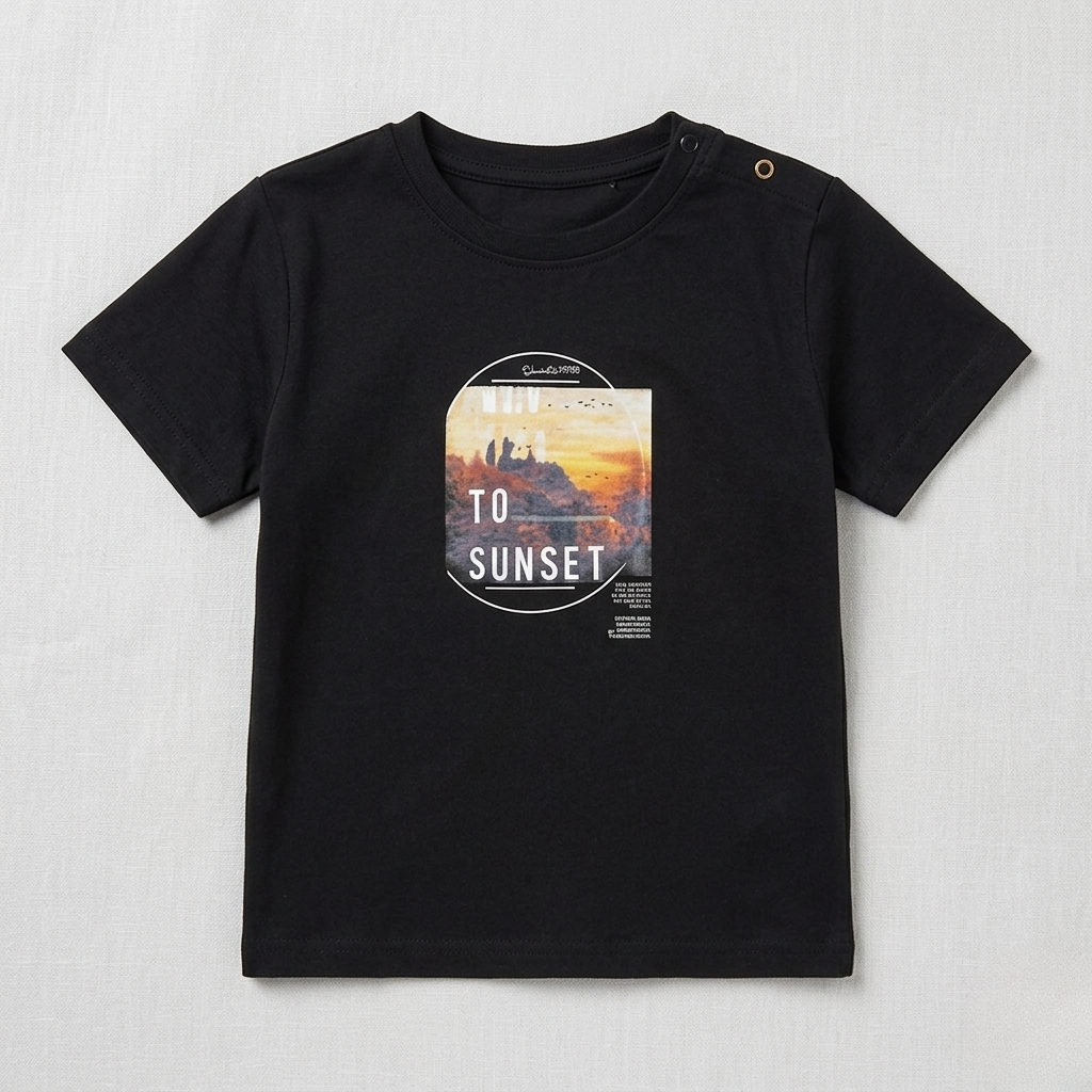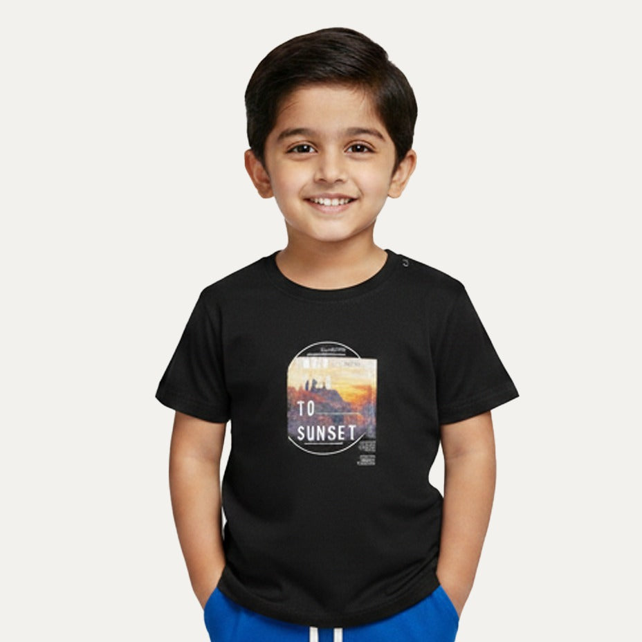 Black Sun Rise Print Half Sleeves T-Shirt For Boys Brighten up your boy's wardrobe with this eye-catching tee featuring a bold sun rise print that's sure to turn heads. Crafted from soft, breathable fabric, it's perfect for everyday wear—whether he's playing outside, hanging with friends, or just chilling at home. The classic half-sleeve design keeps things cool and comfortable, while the striking graphic adds personality and style. A versatile piece that pairs easily with jeans, shorts, or anything in his closet!