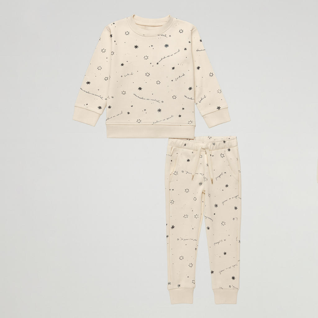 Wrap yourself in cozy comfort with this charming cream jersey fabric suit, perfect for staying warm through the chilly season. Featuring an adorable stars print design, this winter essential combines style with practicality. The soft, breathable jersey material moves with you while keeping the cold at bay, making it ideal for layering or wearing solo on milder days. Whether you're lounging at home or stepping out for casual outings, this playful printed suit brings a touch of whimsy to your winter wardrobe. Embrace the season in style and comfort.