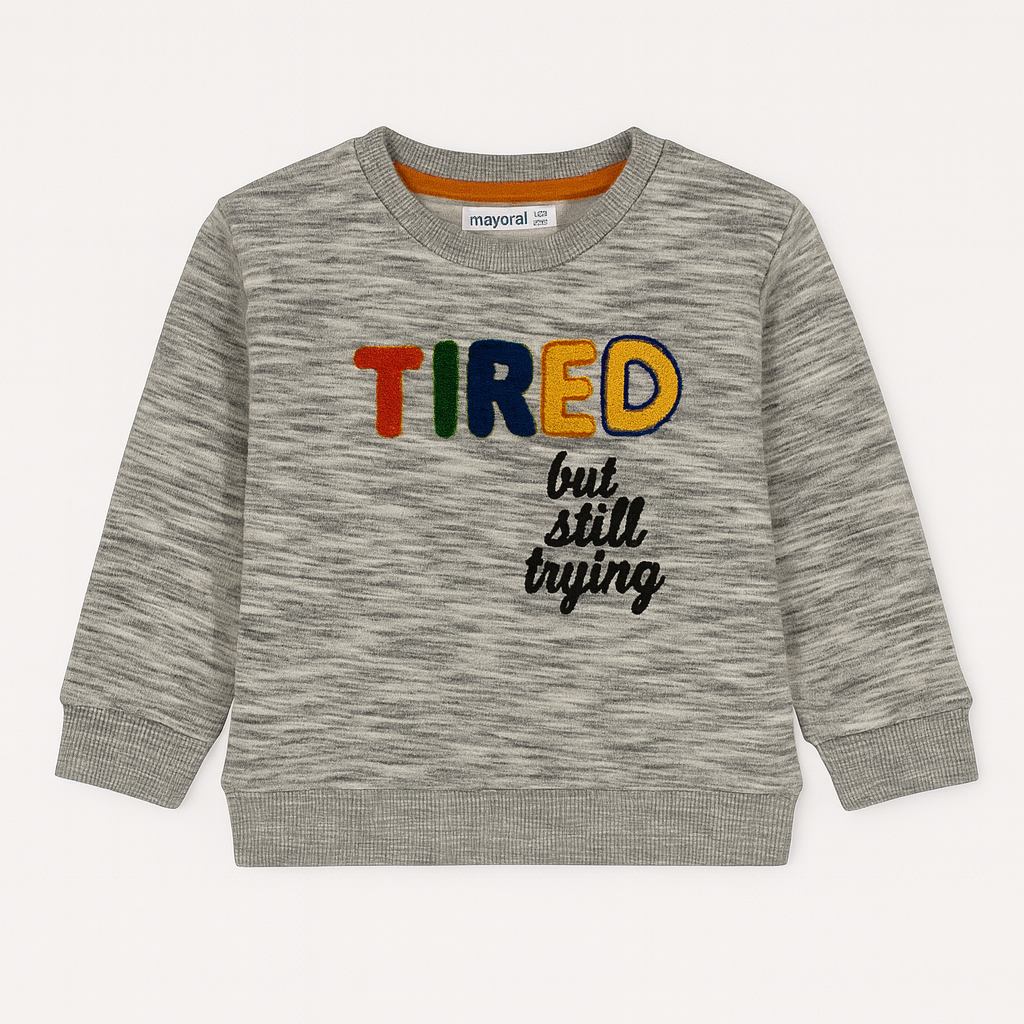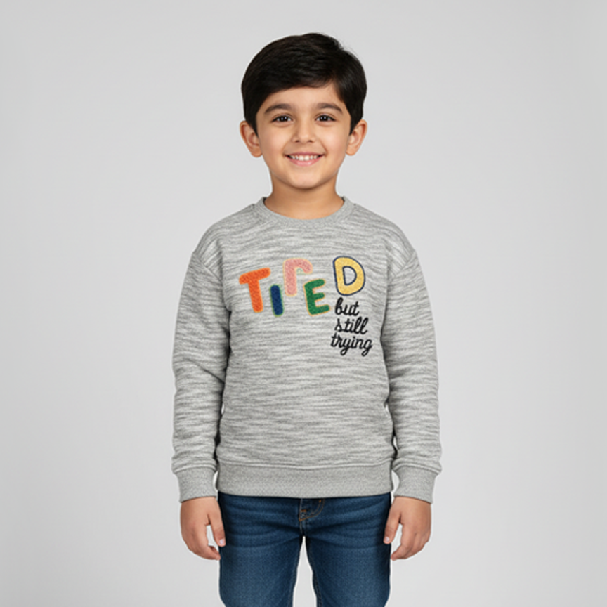 Stay cozy and cool with this Grey Tired Fleece Fabric Sweatshirt. Made from soft fleece, it’s perfect for lounging or casual outings. Its relaxed fit and comfy fabric feel like a hug that says, "It’s okay to be a little tired today." Add a playful touch to your chill days with this effortlessly stylish sweatshirt.