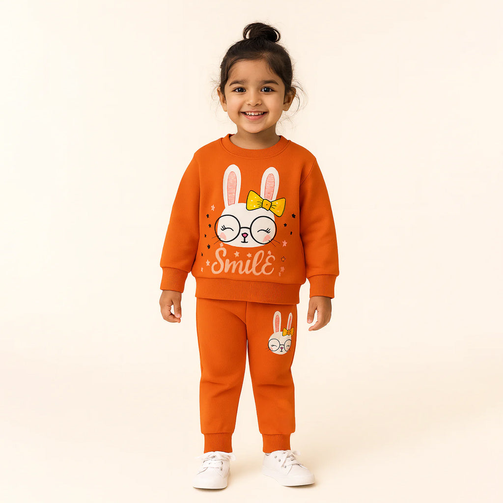 Dark Peach Rabbit Smile Print Terry Fabric Suit For Winters