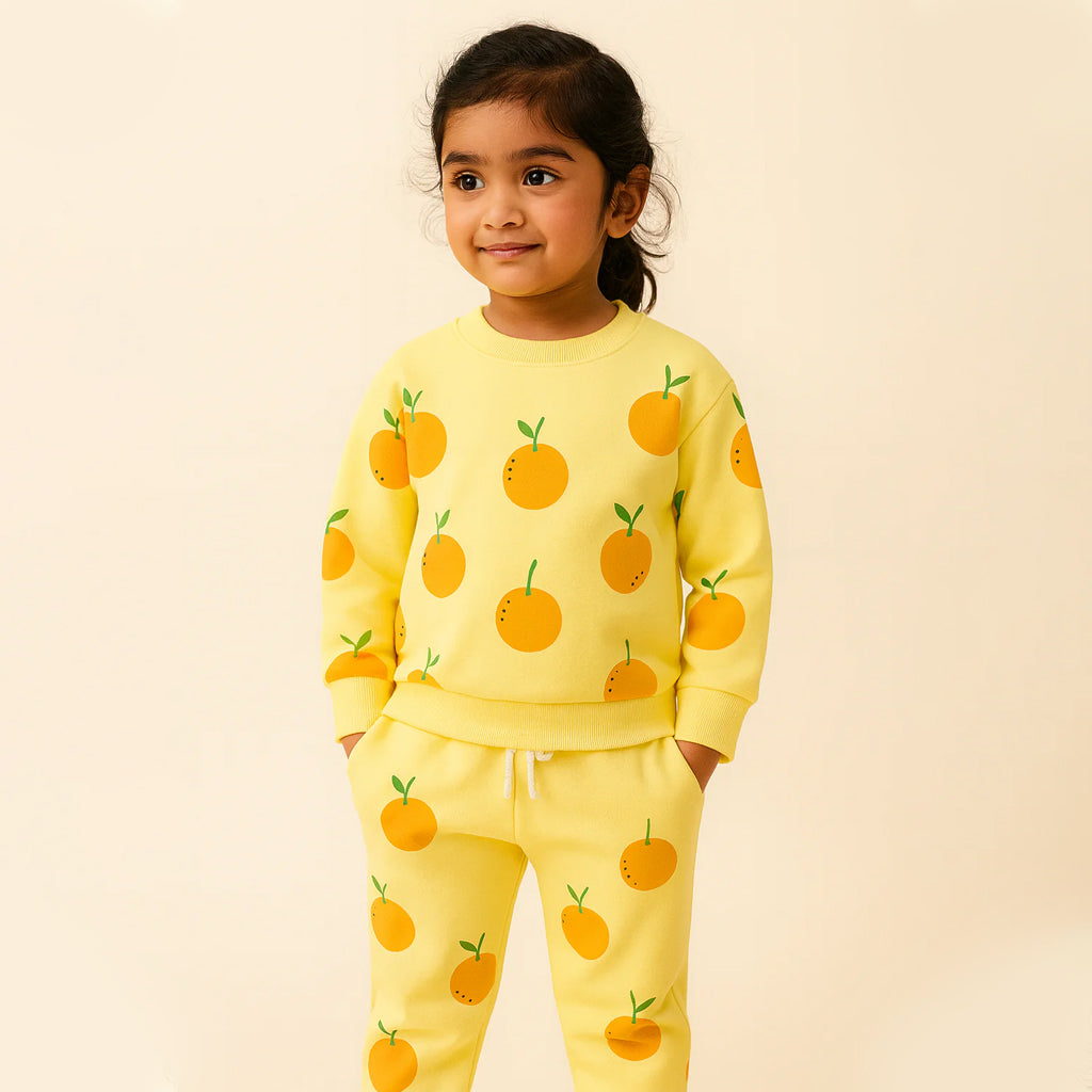 Brighten your winter days with this cheerful yellow terry fabric suit featuring vibrant orange prints. Soft and cozy, it offers warmth and comfort while adding a playful splash of color to your cold-weather wardrobe. Perfect for staying snug with a fun twist!