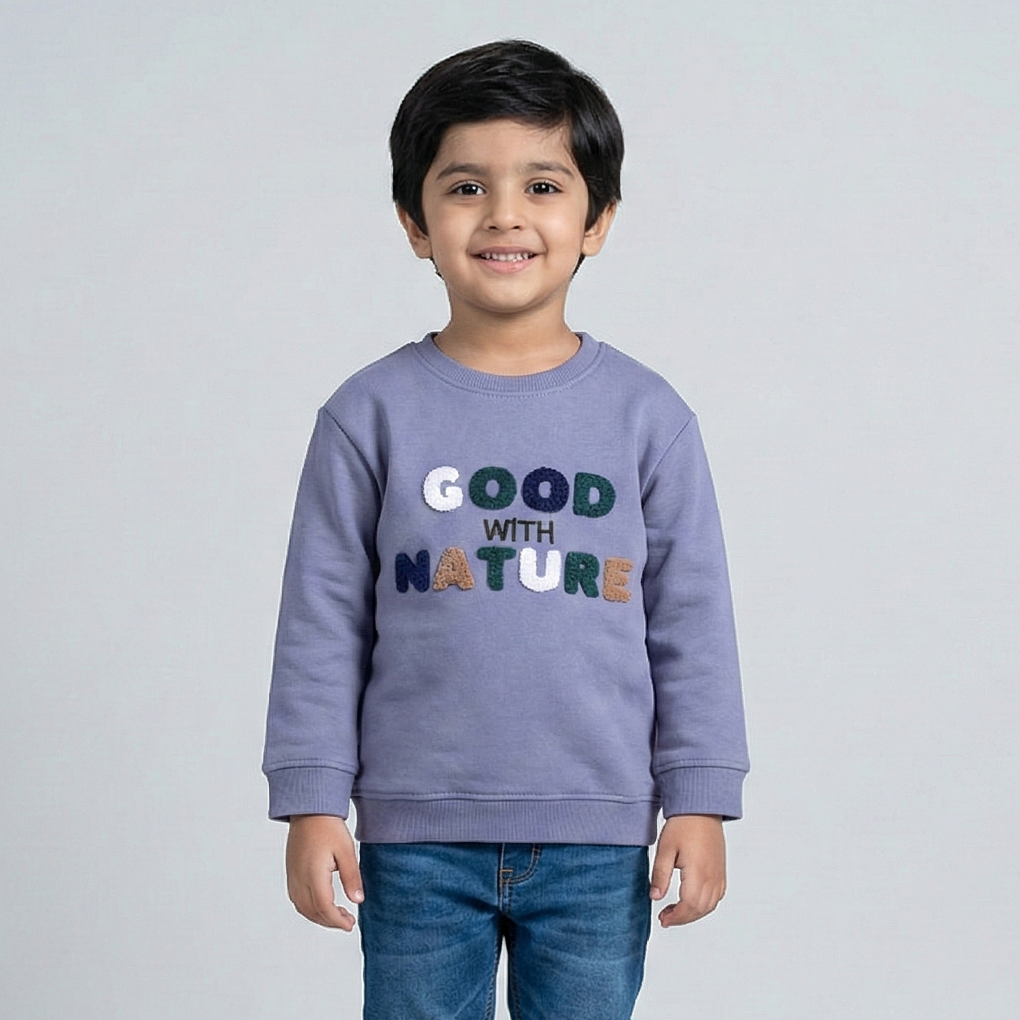 Embrace your love for nature with this cozy grey sweatshirt! Made of embroidered terry fabric, it's perfect for staying warm while enjoying the great outdoors. Plus, the playful "Good with Nature" slogan adds a quirky touch to your wardrobe. (Only 34 words, perfect!)