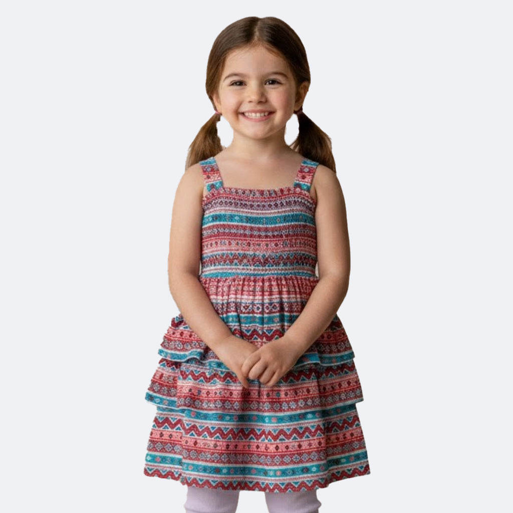 Add a pop of color and geometric flair to your little girl's wardrobe with our MULTI COLOR GEOMETRY DESIGN SLEEVES LESS FROCK! Featuring a fun and playful design, this frock is perfect for any occasion and will have your girl standing out from the crowd. Get yours today!