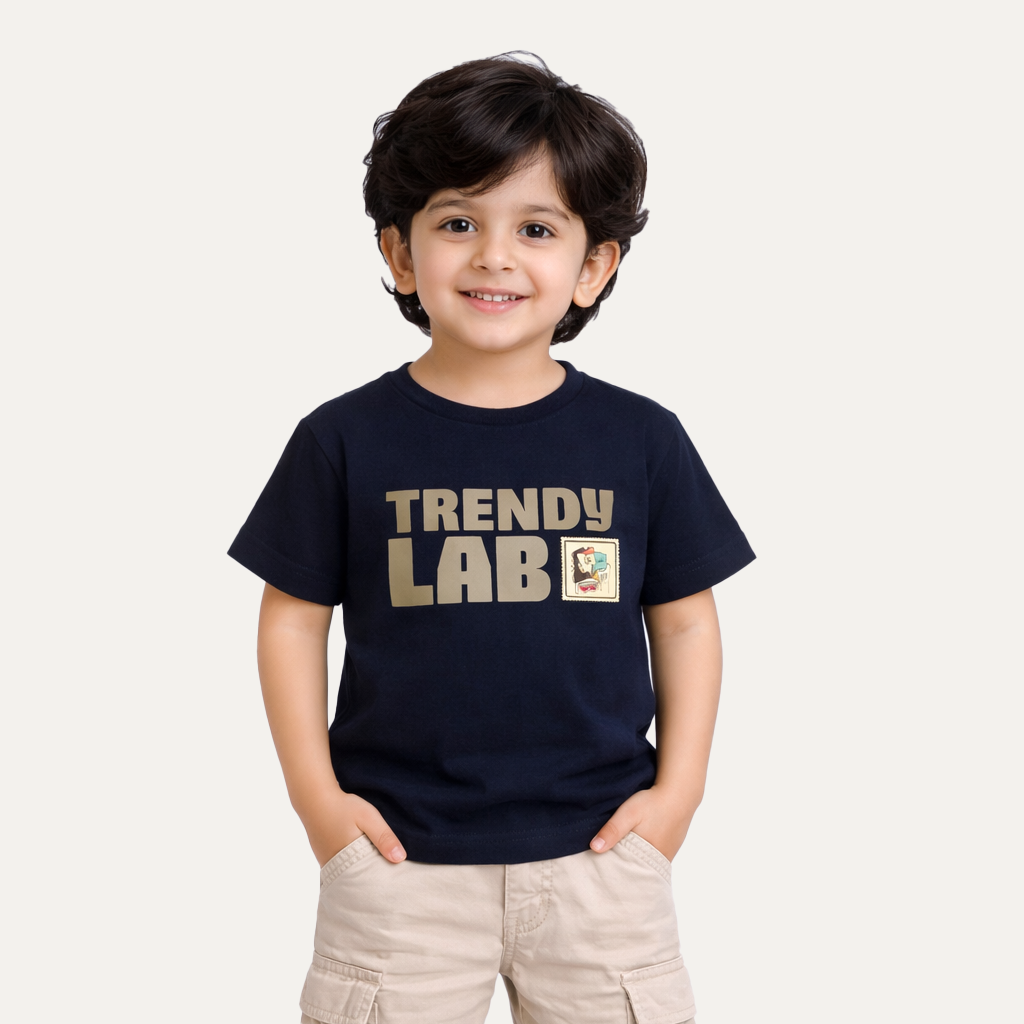 Navy Blue Trendy Lab Print Half Sleeves T-Shirt For Boys